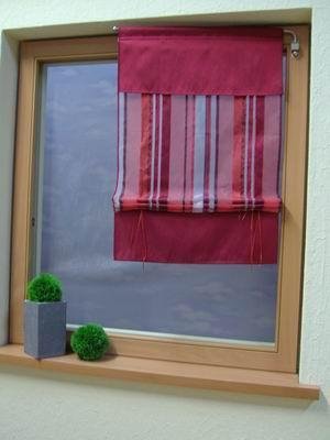 Das bordeauxrote Bändchenrollo mit Längsstreifen aus dem luftigen und leichten Stoff IGNATIO sorgt für eine perfekte Fensterdekoration.