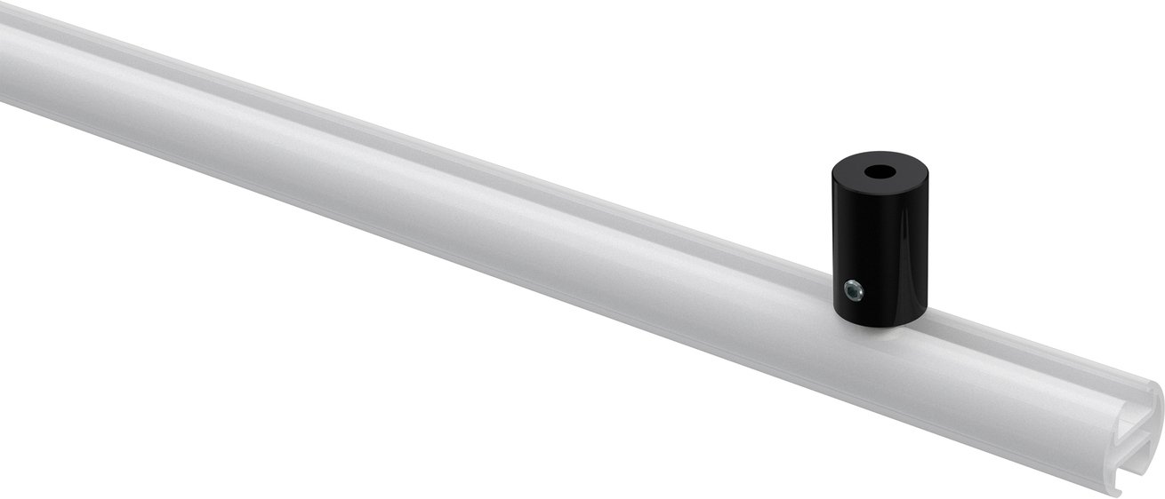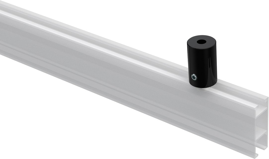Der Deckenträger Sonius sorgt für stabile Befestigung der Innenlaufstangen mit 20 mm Stangendurchmesser. Eine Halterung wie dieser Deckenträger in Schwarz ist auf die Innenlaufprofile 20 mm Ø und 14x35 mm von Interdeco abgestimmt. Mittels speziellen Einsatz für die Laufnut, wird hierbei eine ganz besonders gute stabile Verbindung zwischen Deckenhalter und Innenlaufprofil erzeugt..