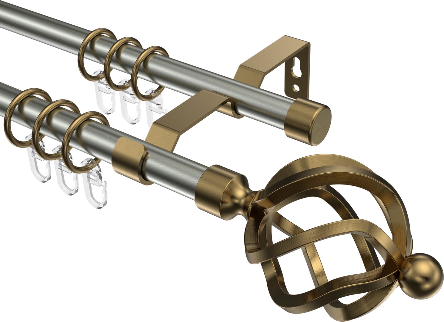 Gardinenstangen aus Metall in 16 mm Ø, 2-läufig, Modell OLYMP - Paolo Edelstahl-Optik / Messing Antik