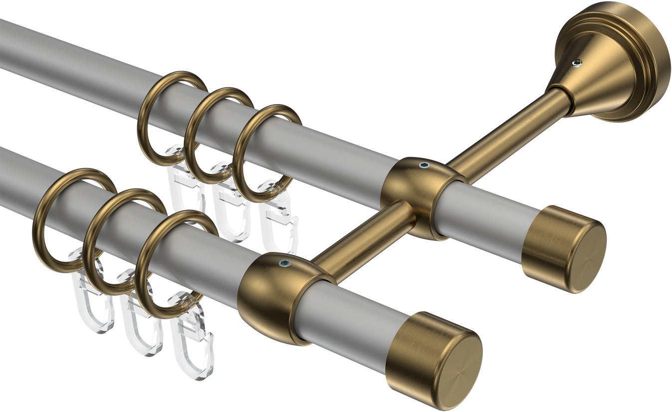 Gardinenstangen aus Metall in 16 mm Ø, 2-läufig, Modell PRIMUS - Lucan Silbergrau / Messing Antik