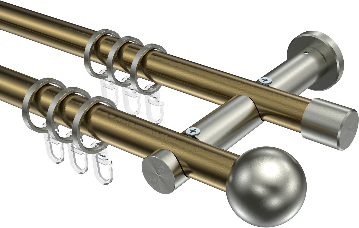 Gardinenstangen aus Metall in 20 mm Ø, 2-läufig, Modell PLATON - Luino Messing Antik / Edelstahl-Optik
