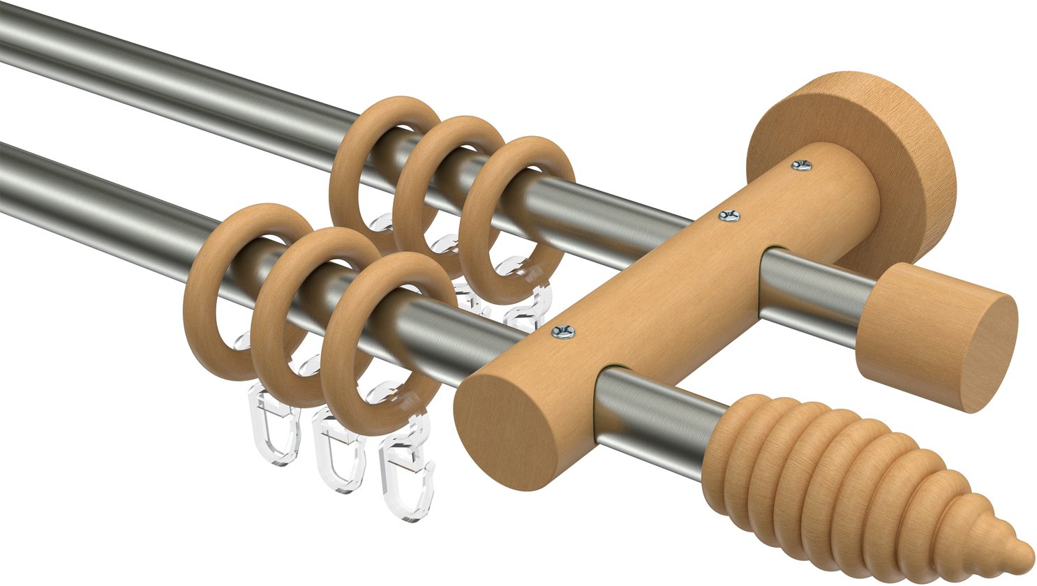 Gardinenstangen aus Metall / Holz in 16 mm Ø, 2-läufig, Modell ADRIAN - Asta Edelstahl-Optik / Buche lackiert