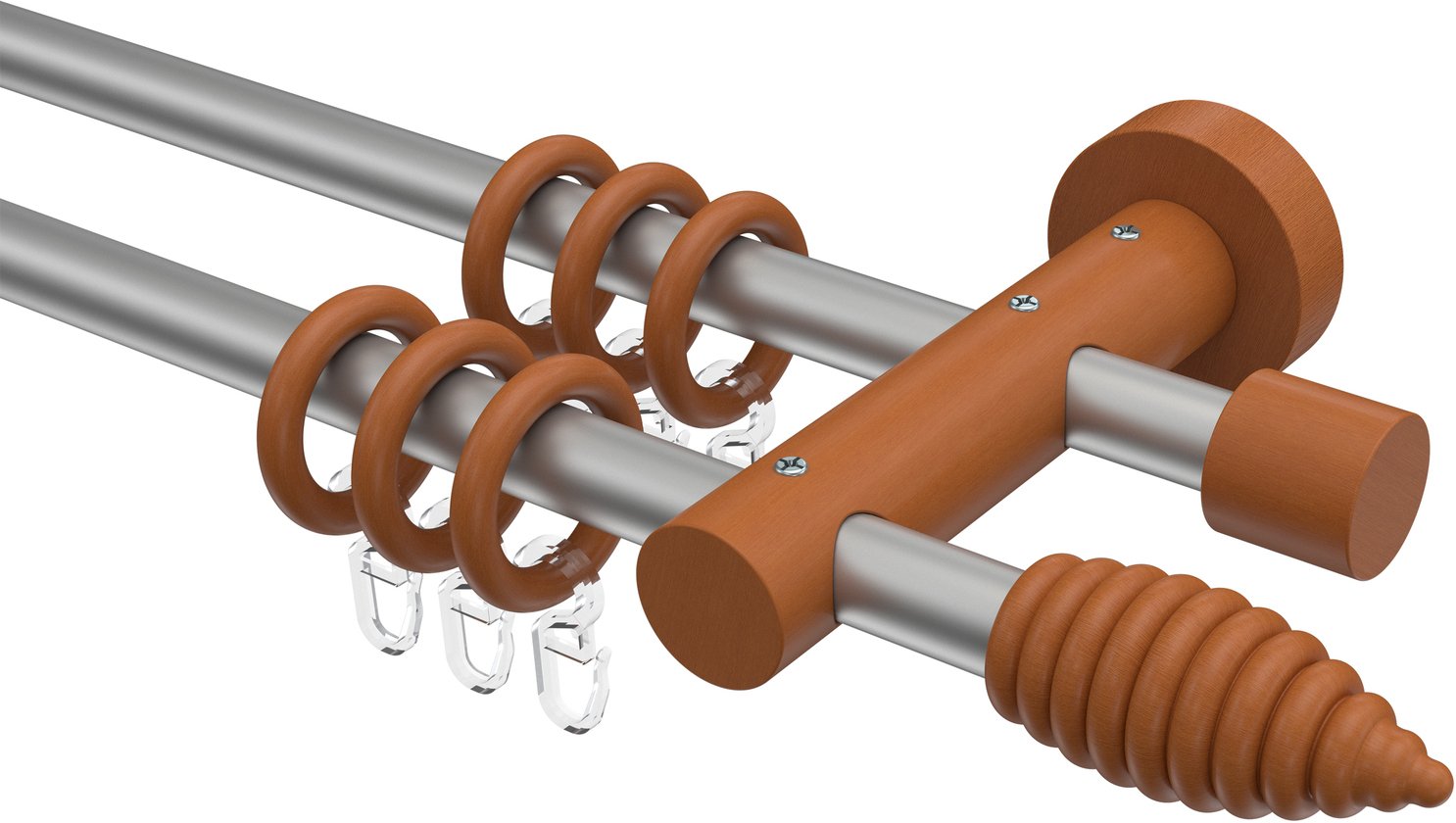 Gardinenstangen aus Metall / Holz in 16 mm Ø, 2-läufig, Modell ADRIAN - Asta Silbergrau / Kirschbaum lackiert