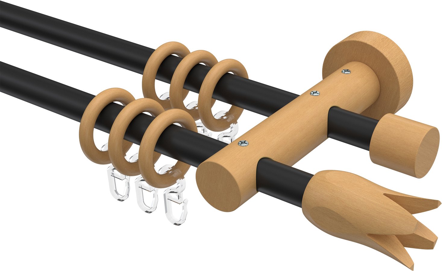 Gardinenstangen aus Metall / Holz in 16 mm Ø, 2-läufig, Modell ADRIAN - Flower Schwarz / Buche lackiert