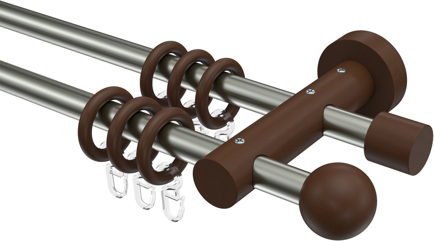 Gardinenstangen aus Metall / Holz in 16 mm Ø, 2-läufig, Modell ADRIAN - Geo Edelstahl-Optik / Nussbaum lackiert