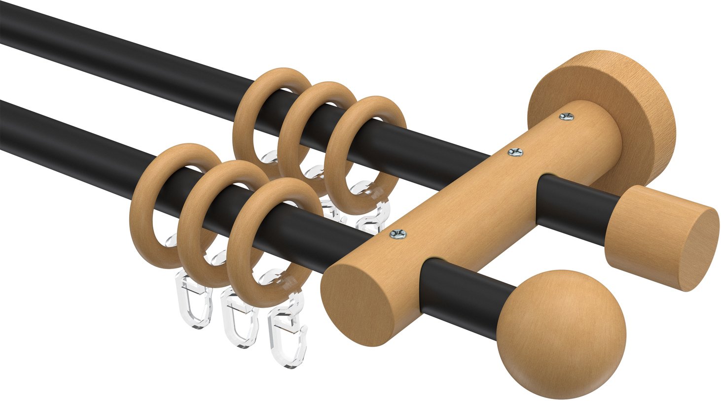 Gardinenstangen aus Metall / Holz in 16 mm Ø, 2-läufig, Modell ADRIAN - Geo Schwarz / Buche lackiert