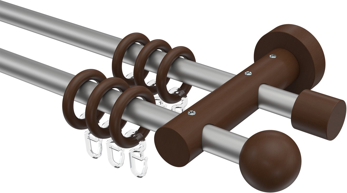 Gardinenstangen aus Metall / Holz in 16 mm Ø, 2-läufig, Modell ADRIAN - Geo Silbergrau / Nussbaum lackiert