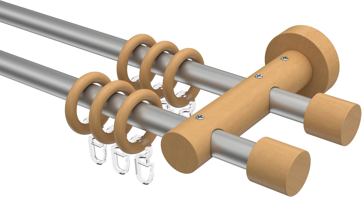 Gardinenstangen aus Metall / Holz in 16 mm Ø, 2-läufig, Modell ADRIAN - Pin Silbergrau / Buche lackiert