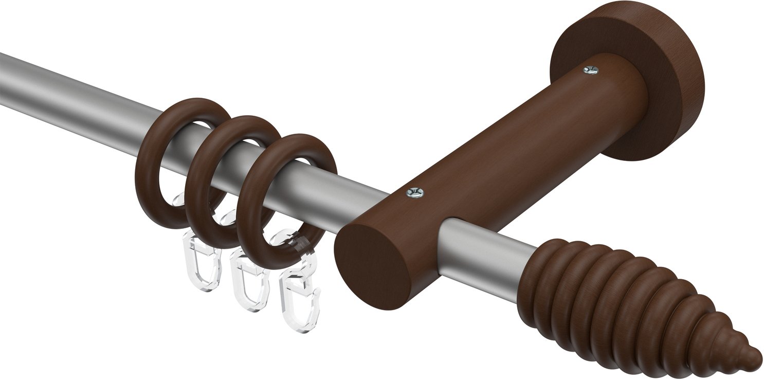 Gardinenstangen aus Metall / Holz in 16 mm Ø, 1-läufig, Modell ADRIAN - Asta Silbergrau / Nussbaum lackiert