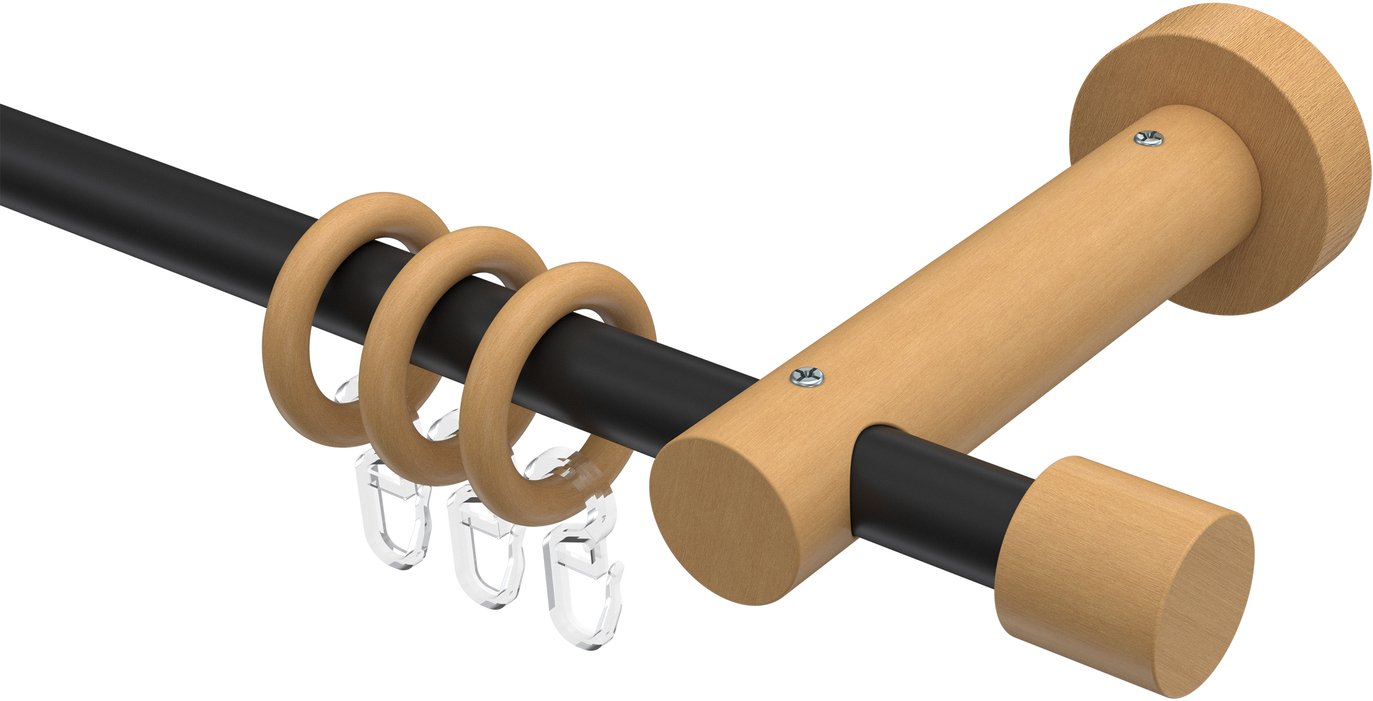 Gardinenstangen aus Metall / Holz in 16 mm Ø, 1-läufig, Modell ADRIAN - Pin Schwarz / Buche lackiert