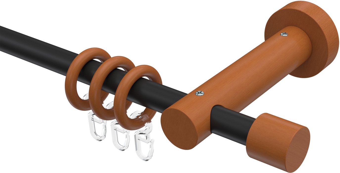 Gardinenstangen aus Metall / Holz in 16 mm Ø, 1-läufig, Modell ADRIAN - Pin Schwarz / Kirschbaum lackiert