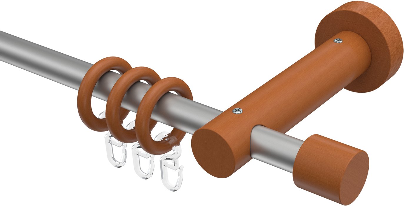 Gardinenstangen aus Metall / Holz in 16 mm Ø, 1-läufig, Modell ADRIAN - Pin Silbergrau / Kirschbaum lackiert