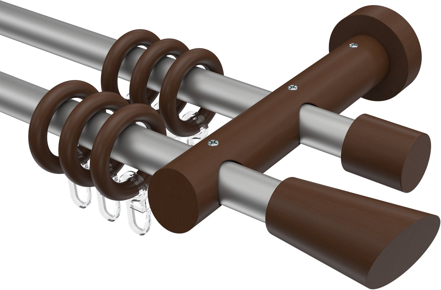 Gardinenstangen aus Metall / Holz in 20 mm Ø, 2-läufig, Modell TALENA - Bero Silbergrau / Nussbaum lackiert