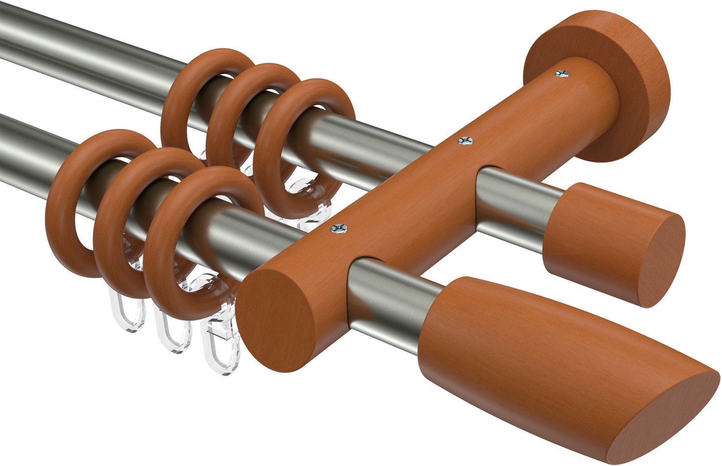 Gardinenstangen aus Metall / Holz in 20 mm Ø, 2-läufig, Modell TALENA - Etta Edelstahl-Optik / Kirschbaum lackiert