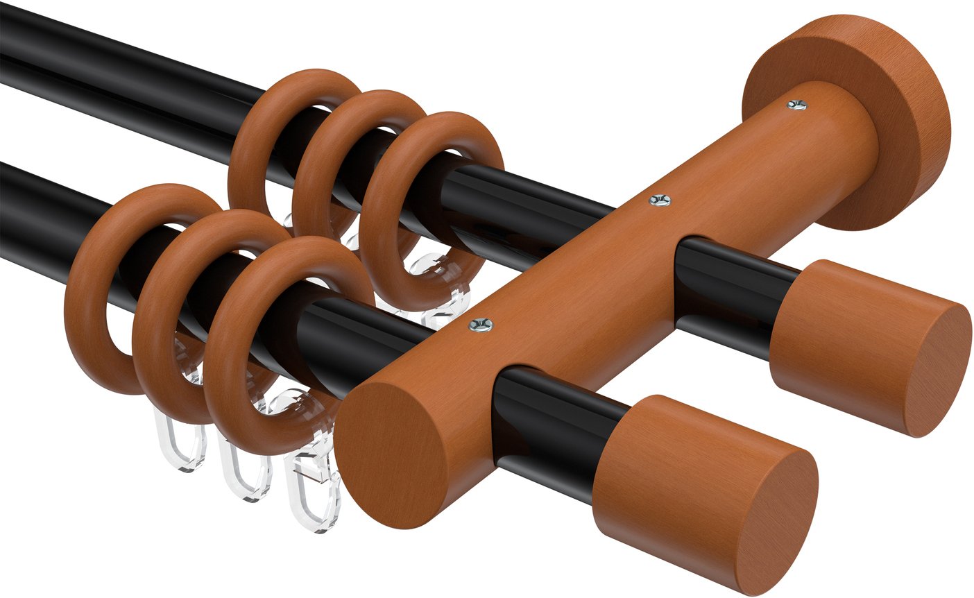Gardinenstangen aus Metall / Holz in 20 mm Ø, 2-läufig, Modell TALENA - Feta Schwarz / Kirschbaum lackiert