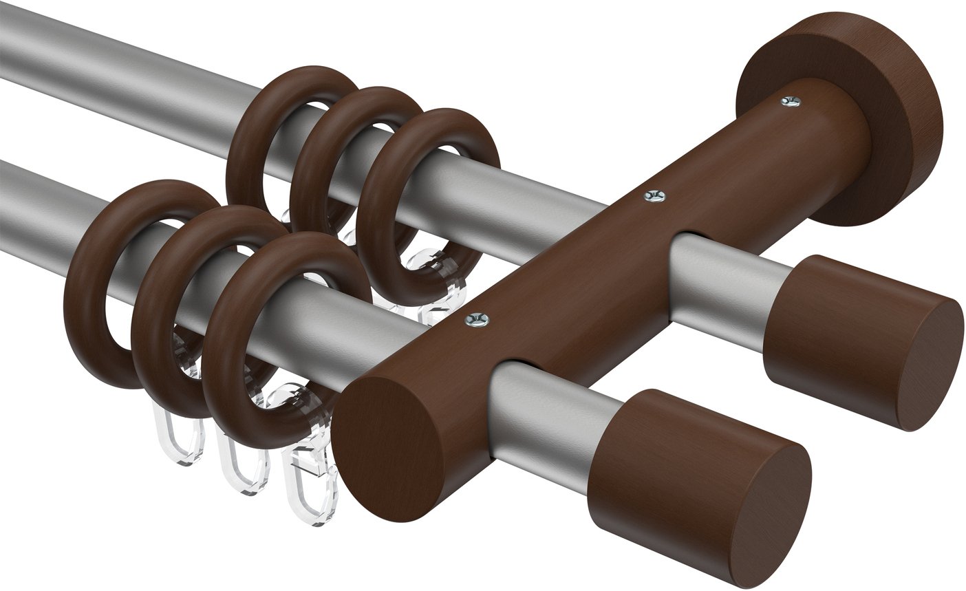 Gardinenstangen aus Metall / Holz in 20 mm Ø, 2-läufig, Modell TALENA - Feta Silbergrau / Nussbaum lackiert
