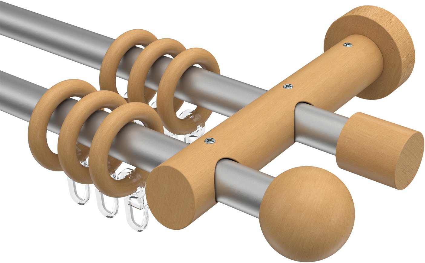 Gardinenstangen aus Metall / Holz in 20 mm Ø, 2-läufig, Modell TALENA - Luina Silbergrau / Buche lackiert