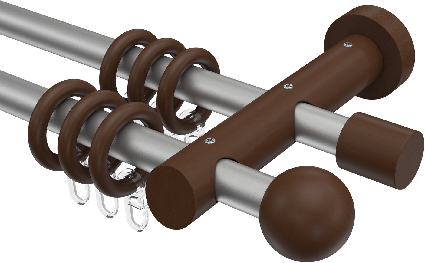 Gardinenstangen aus Metall / Holz in 20 mm Ø, 2-läufig, Modell TALENA - Luina Silbergrau / Nussbaum lackiert