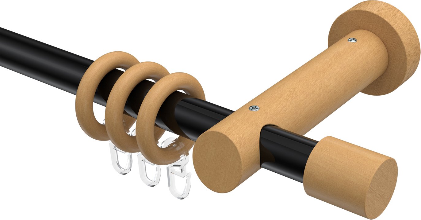Gardinenstangen aus Metall / Holz in 20 mm Ø, 1-läufig, Modell TALENA - Feta Schwarz / Buche lackiert