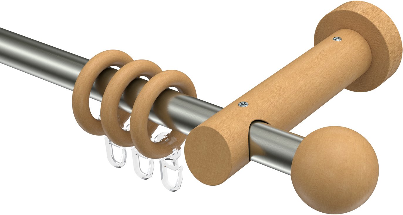 Gardinenstangen aus Metall / Holz in 20 mm Ø, 1-läufig, Modell TALENA - Luina Edelstahl-Optik / Buche lackiert