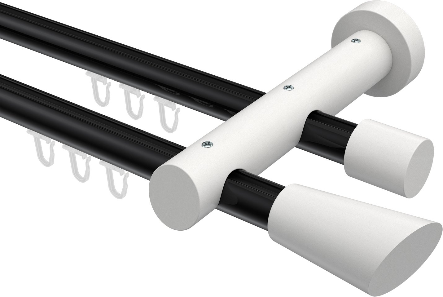 Gardinenstangen mit Innenlauf aus Aluminium / Holz in 20 mm Ø, 2-läufig, Modell TALENT - Bero Schwarz / Weiß lackiert