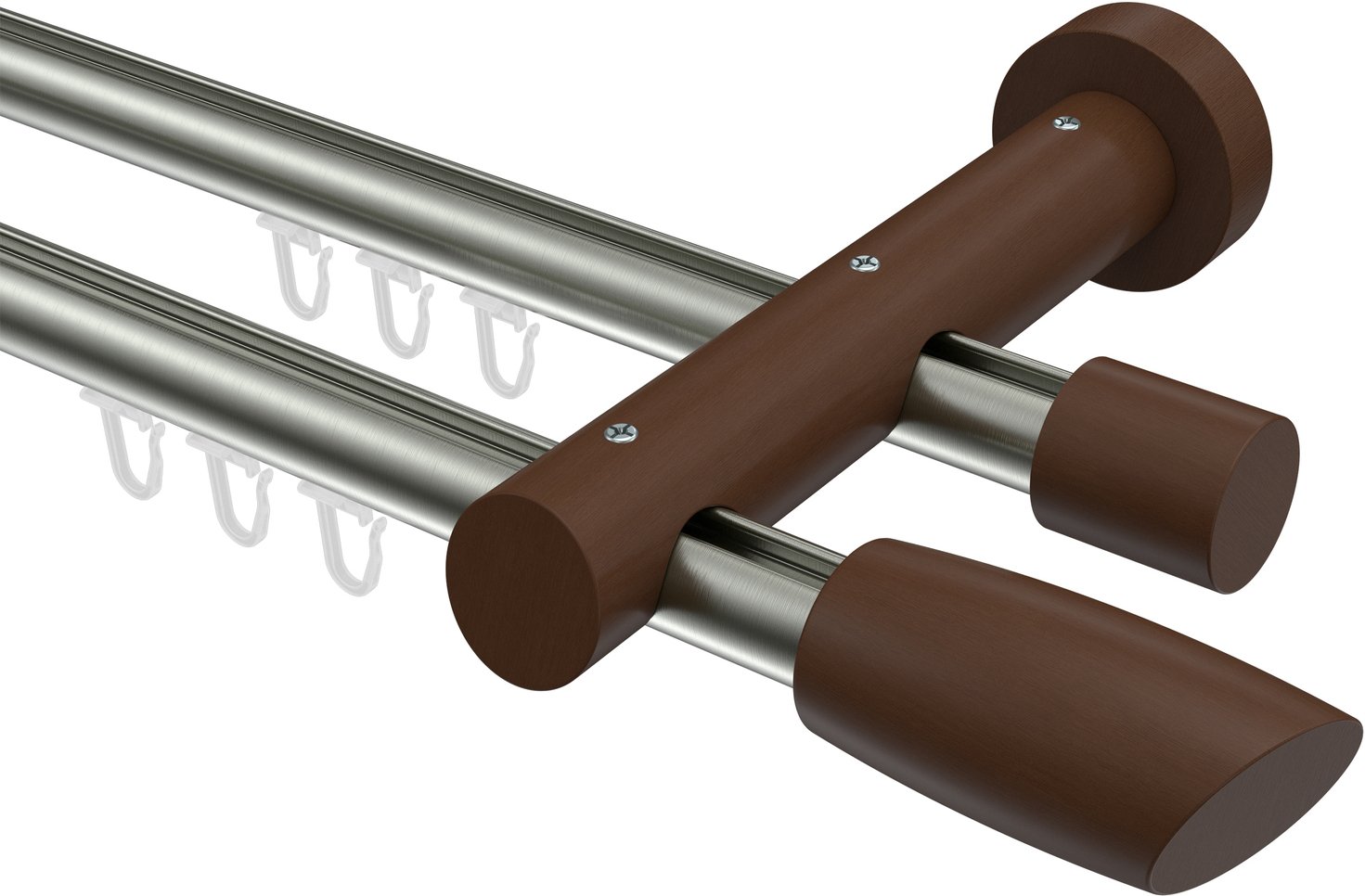 Gardinenstangen mit Innenlauf aus Aluminium / Holz in 20 mm Ø, 2-läufig, Modell TALENT - Etta Edelstahl-Optik / Nussbaum lackiert