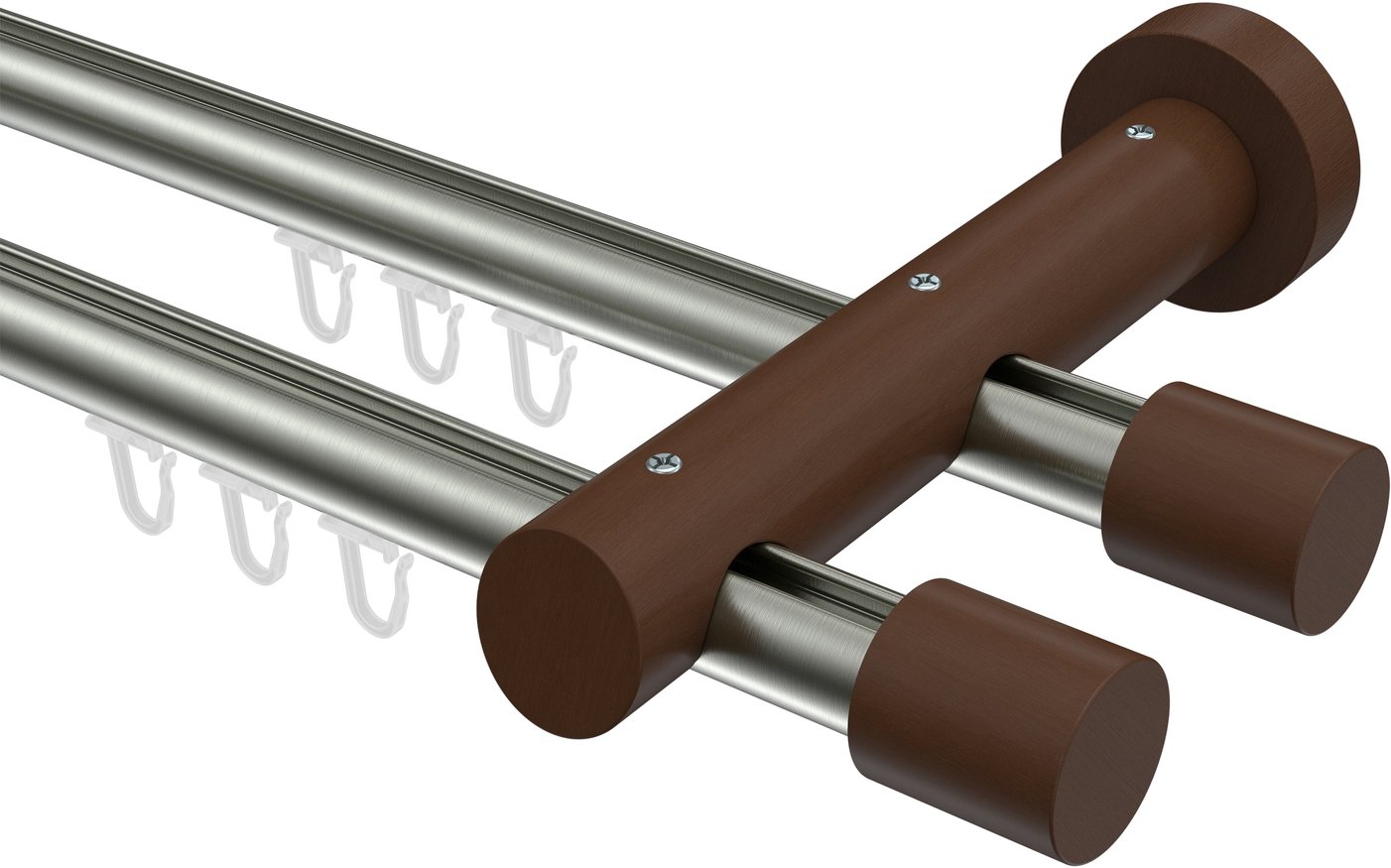 Gardinenstangen mit Innenlauf aus Aluminium / Holz in 20 mm Ø, 2-läufig, Modell TALENT - Feta Edelstahl-Optik / Nussbaum lackiert