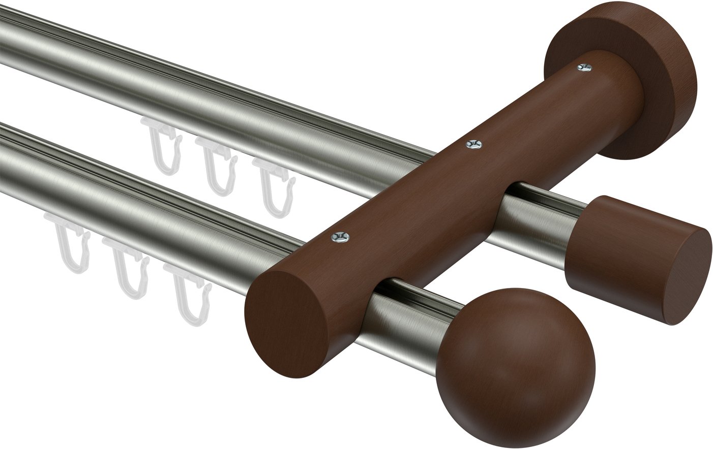 Gardinenstangen mit Innenlauf aus Aluminium / Holz in 20 mm Ø, 2-läufig, Modell TALENT - Luina Edelstahl-Optik / Nussbaum lackiert