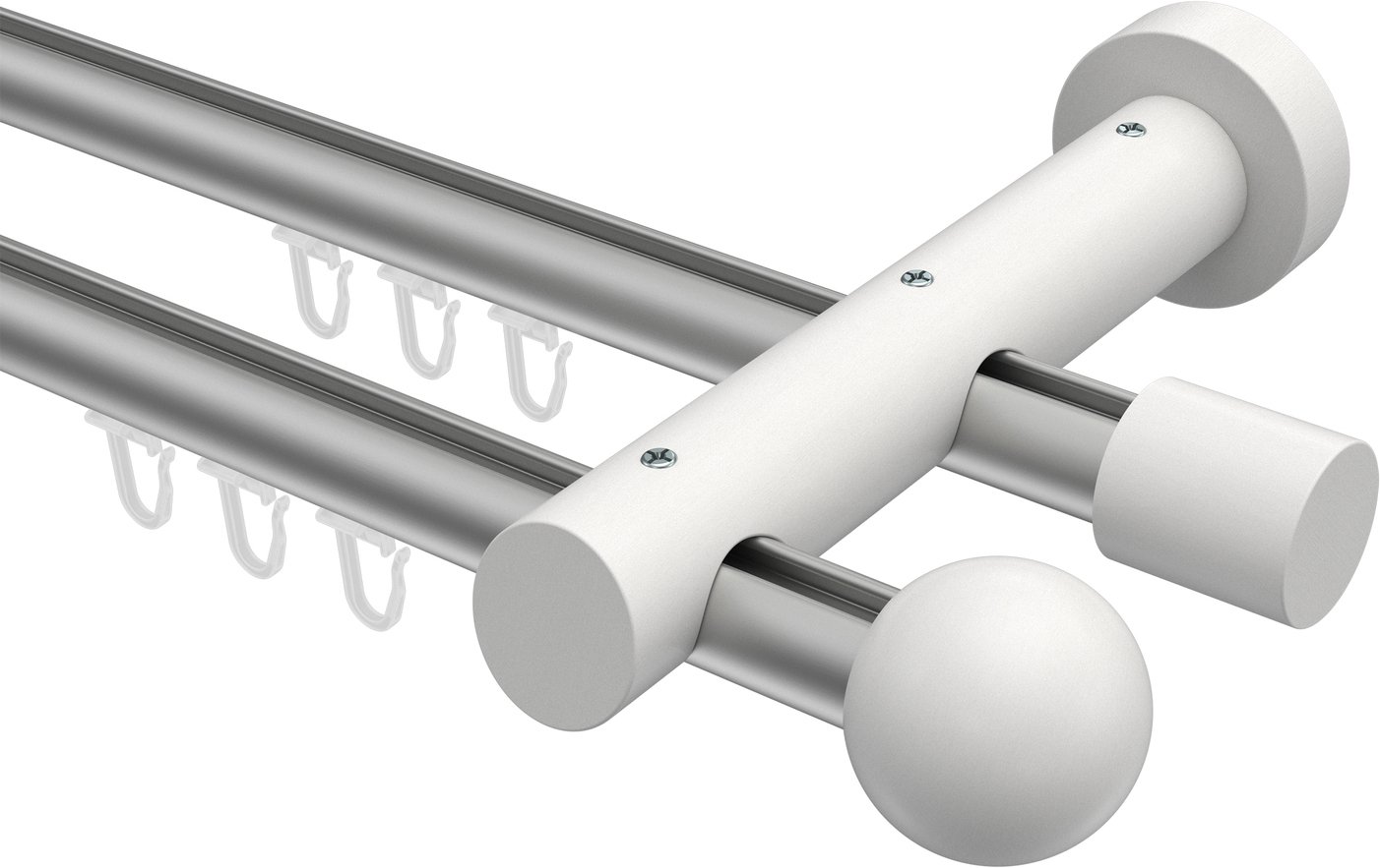 Gardinenstangen mit Innenlauf aus Aluminium / Holz in 20 mm Ø, 2-läufig, Modell TALENT - Luina Silbergrau / Weiß lackiert