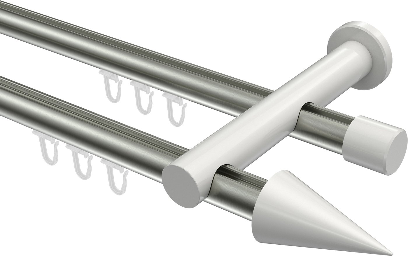 Gardinenstangen mit Innenlauf aus Aluminium / Metall in 20 mm Ø, 2-läufig, Modell PLATON - Savio Edelstahl-Optik / Weiß