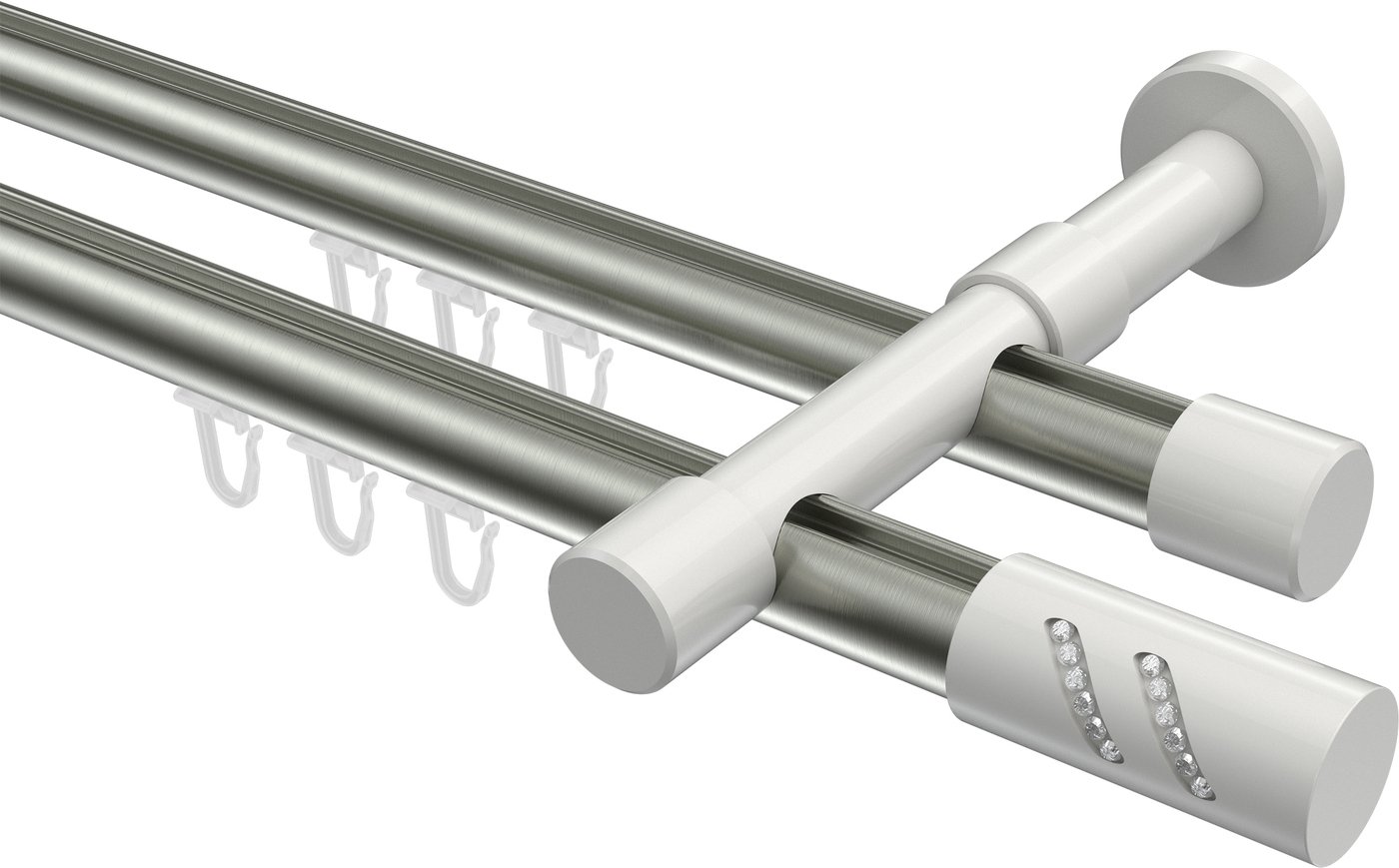 Gardinenstangen mit Innenlauf aus Aluminium / Metall in 20 mm Ø, 2-läufig, Modell PRESTIGE - Zoena Edelstahl-Optik / Weiß