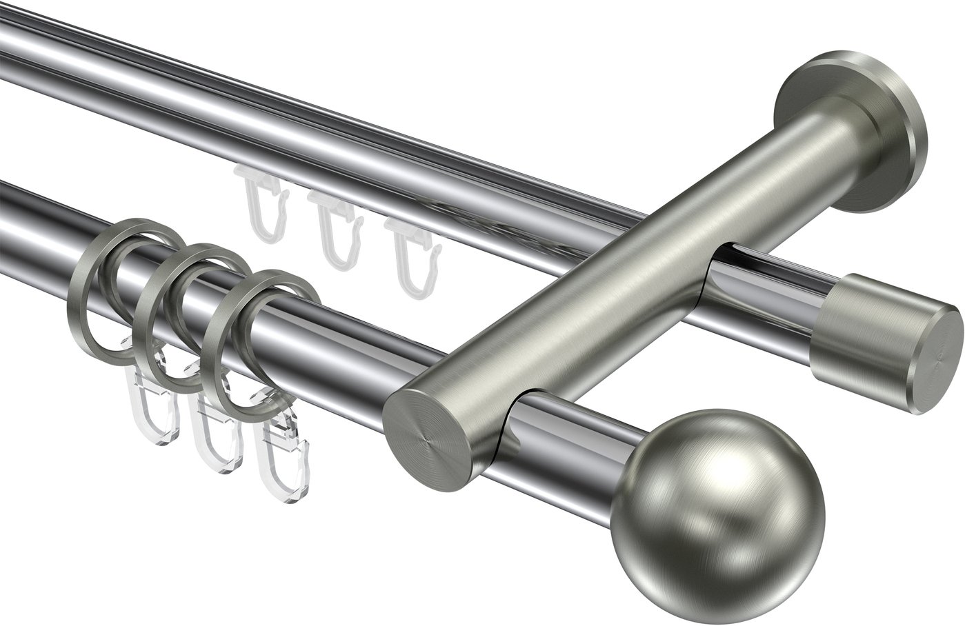 Rundrohr-Innenlauf Gardinenstangen aus Aluminium / Metall in 20 mm Ø, 2-läufig, Modell PLATON - Luino Chrom / Edelstahl-Optik