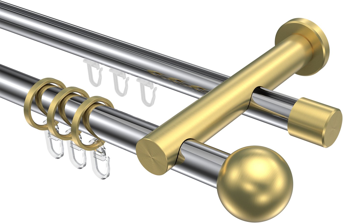 Rundrohr-Innenlauf Gardinenstangen aus Aluminium / Metall in 20 mm Ø, 2-läufig, Modell PLATON - Luino Chrom / Messing-Optik