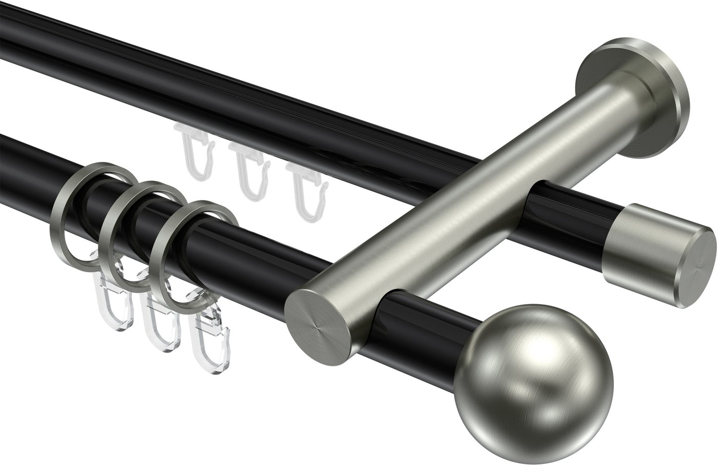 Rundrohr-Innenlauf Gardinenstangen aus Aluminium / Metall in 20 mm Ø, 2-läufig, Modell PLATON - Luino Schwarz / Edelstahl-Optik