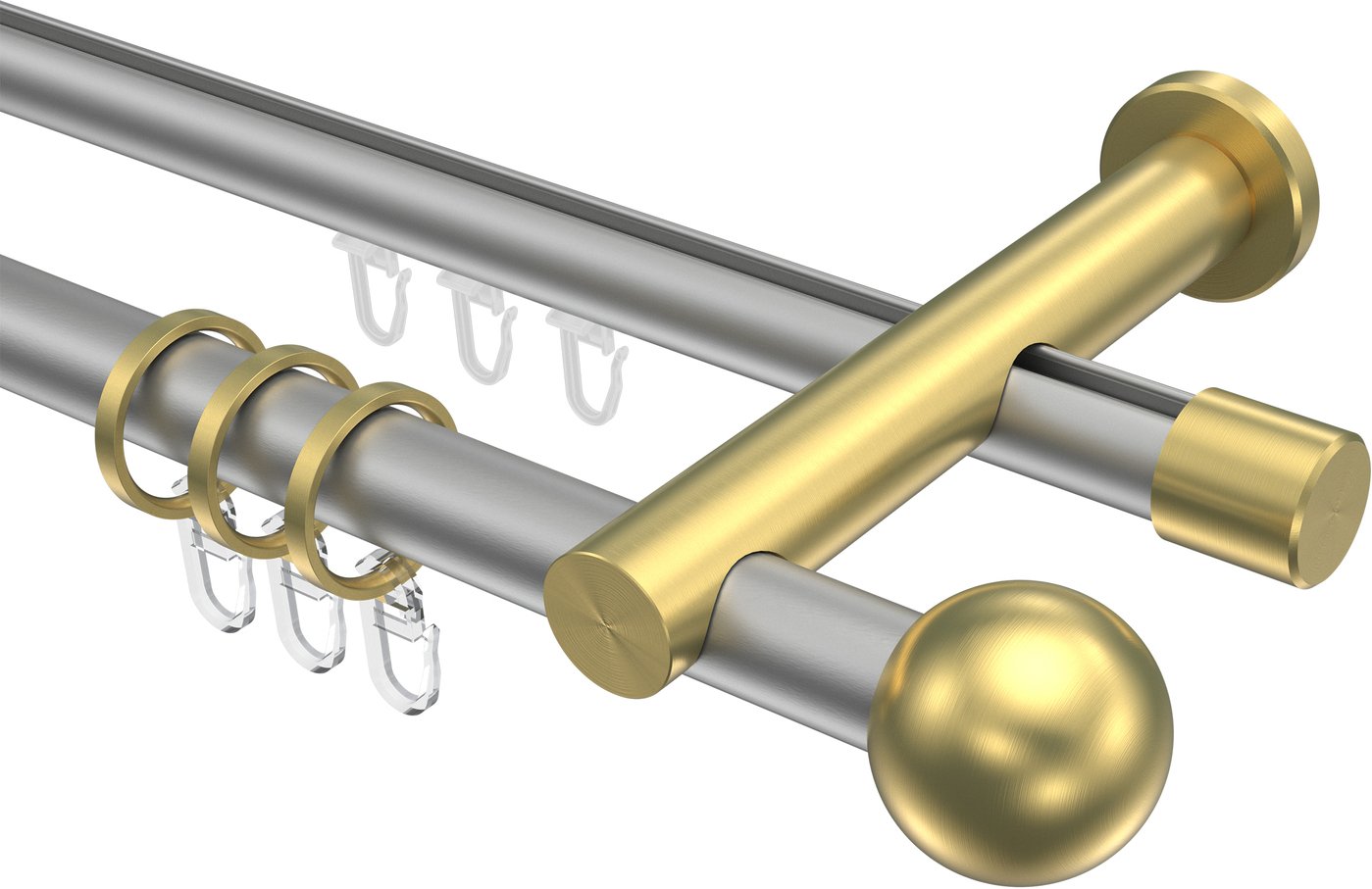 Rundrohr-Innenlauf Gardinenstangen aus Aluminium / Metall in 20 mm Ø, 2-läufig, Modell PLATON - Luino Silbergrau / Messing-Optik