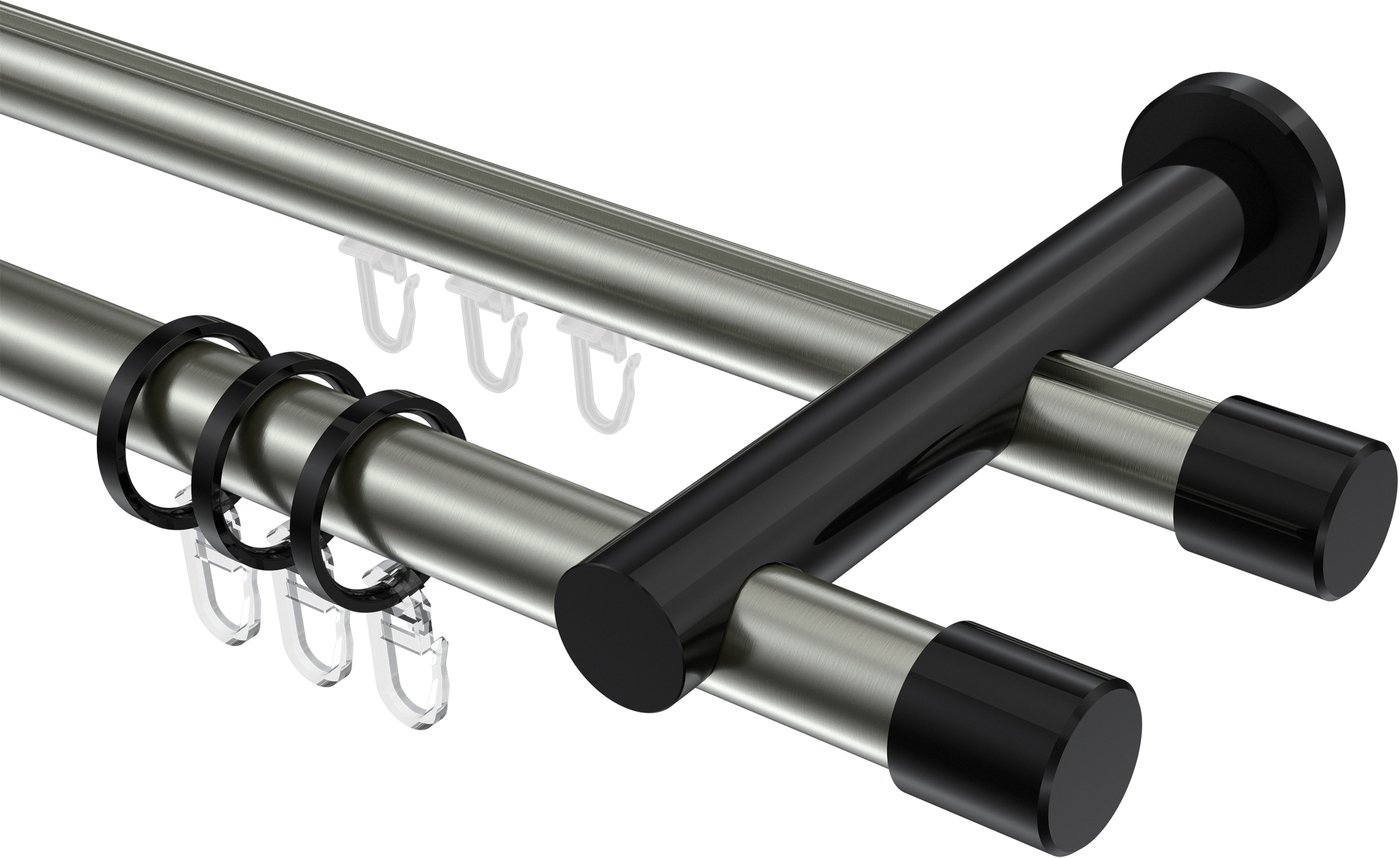 Rundrohr-Innenlauf Gardinenstangen aus Aluminium / Metall in 20 mm Ø, 2-läufig, Modell PLATON - Santo Edelstahl-Optik / Schwarz