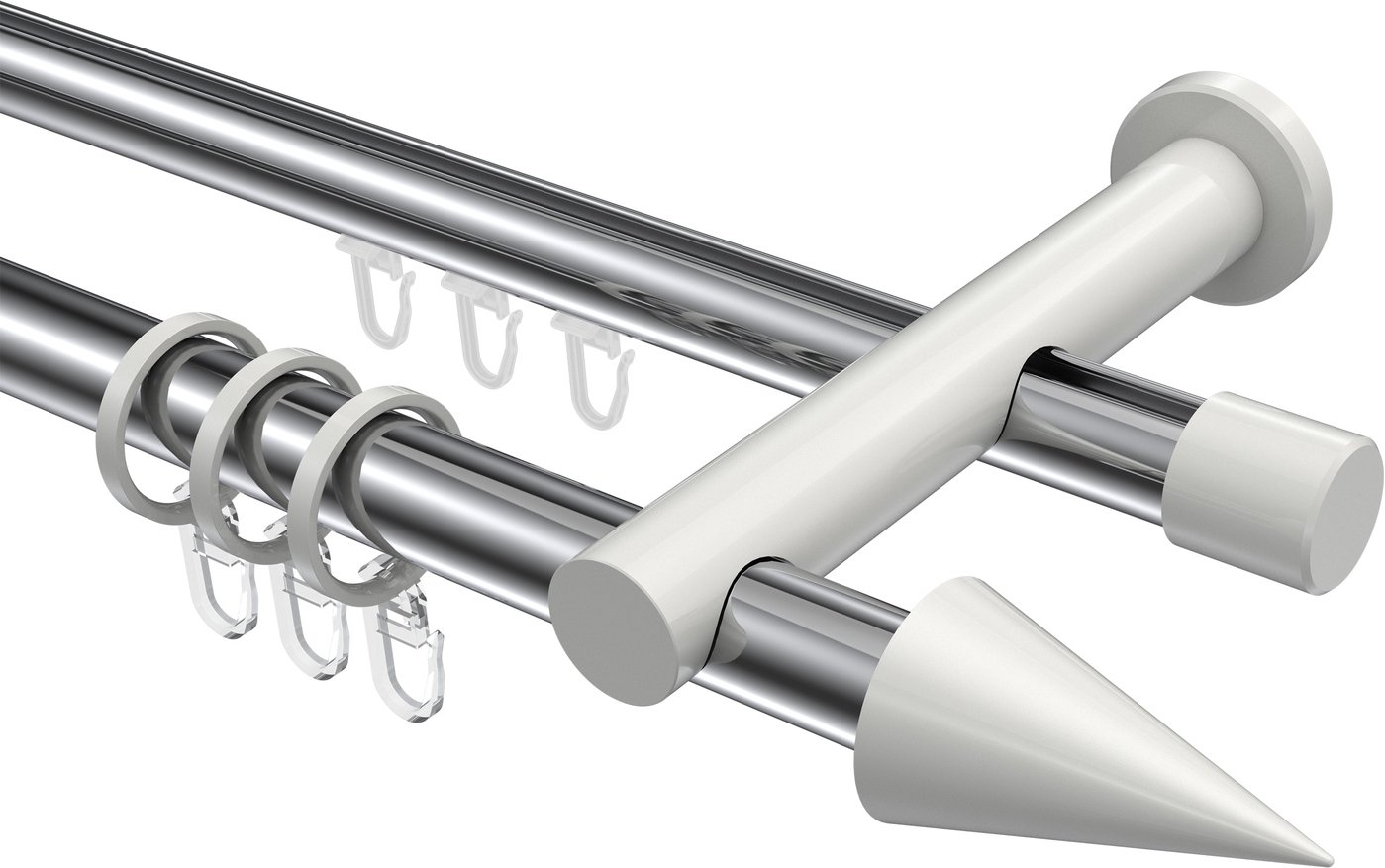 Rundrohr-Innenlauf Gardinenstangen aus Aluminium / Metall in 20 mm Ø, 2-läufig, Modell PLATON - Savio Chrom / Weiß