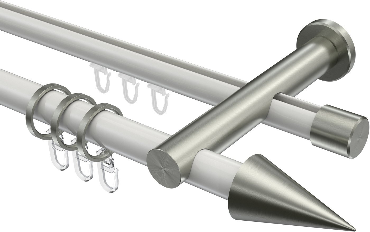 Rundrohr-Innenlauf Gardinenstangen aus Aluminium / Metall in 20 mm Ø, 2-läufig, Modell PLATON - Savio Weiß / Edelstahl-Optik