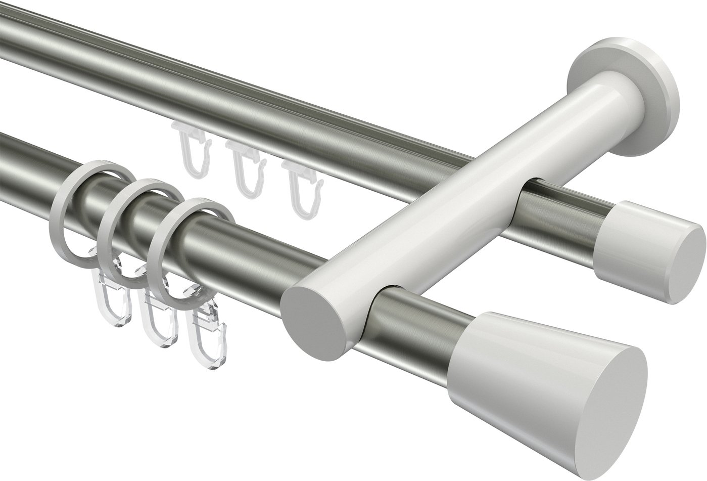Rundrohr-Innenlauf Gardinenstangen aus Aluminium / Metall in 20 mm Ø, 2-läufig, Modell PLATON - Sitra Edelstahl-Optik / Weiß