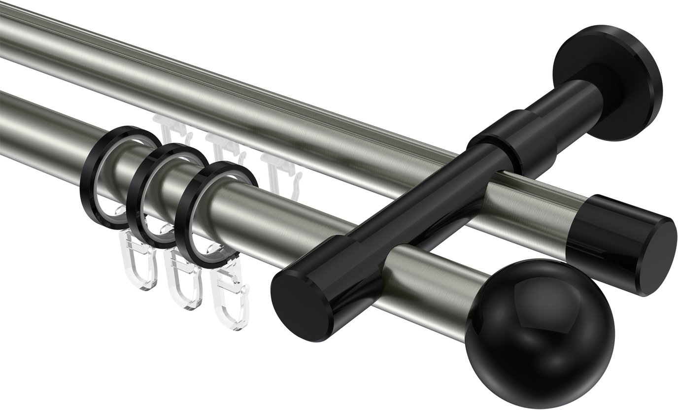 Rundrohr-Innenlauf Gardinenstangen aus Aluminium / Metall in 20 mm Ø, 2-läufig, Modell PRESTIGE - Luino Edelstahl-Optik / Schwarz