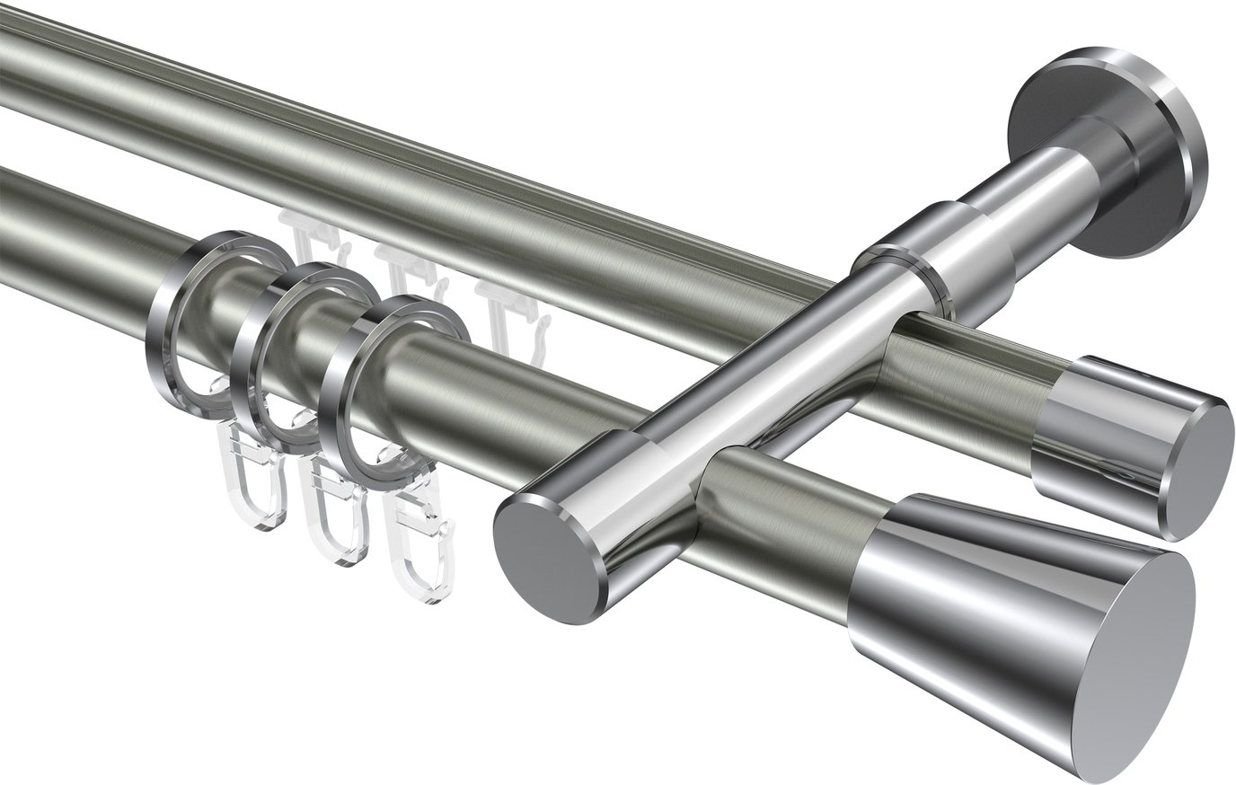 Rundrohr-Innenlauf Gardinenstangen aus Aluminium / Metall in 20 mm Ø, 2-läufig, Modell PRESTIGE - Sitra Edelstahl-Optik / Chrom