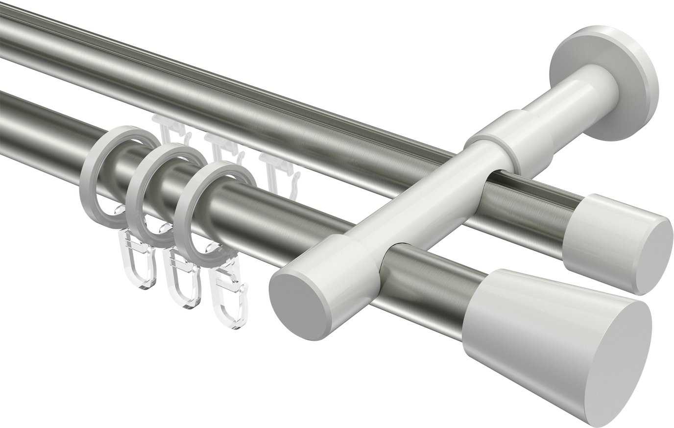 Rundrohr-Innenlauf Gardinenstangen aus Aluminium / Metall in 20 mm Ø, 2-läufig, Modell PRESTIGE - Sitra Edelstahl-Optik / Weiß