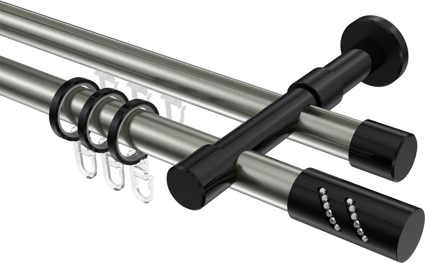 Rundrohr-Innenlauf Gardinenstangen aus Aluminium / Metall in 20 mm Ø, 2-läufig, Modell PRESTIGE - Zoena Edelstahl-Optik / Schwarz
