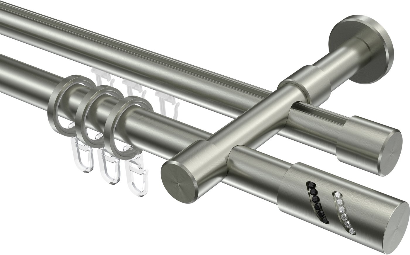 Wir bieten Ihnen hier eine qualitativ hochwertige Innenlauf-Rundrohr Vorhangstange mit 20 mm Ø aus Aluminium und Metallin einem modernen und edlen Design an, dessen schmuckvolle Endstücke mit Glitzersteinen bestückt sind. Unsere doppelläufige Innenlauf-Rundrohr Vorhangstange Modell PRESTIGE - Zoena in Edelstahl-Optik zeichnet sich nicht nur durch den schönen Look, sondern auch durch die hohe Stabilität und einfacher Montage aus. Mit der Innenlauf-Rundrohr Gardinenstange Modell PRESTIGE - Zoena treffen Sie eine gute Wahl für das dekorative Anbringen der Gardinen und Vorhänge. Da wir unsere Vorhanggarnitur Modell PRESTIGE - Zoena in vielen verfügbaren Längen anbieten können, wird es Ihnen leicht fallen, sämtliche Fenster mit dieser Gardinenstange auszustatten, ganz individuell und ganz nach Ihrem Geschmack. Die Befestigung von unserer Vorhangstange Modell PRESTIGE - Zoena und anschließendem Anbringen der Gardinen ist sehr einfach vorzunehmen. Diese als komplett konfektioniertes Set angebotene Innenlauf-Rundrohr Garduinenstange beinhaltet auch das benötigte Befestigungszubehör. Auch das erforderliche Gardinenzubehör zum Einhängen der Gardinen und Vorhänge befinden sich im Lieferumfang von unserer Vorhanggarnitur.