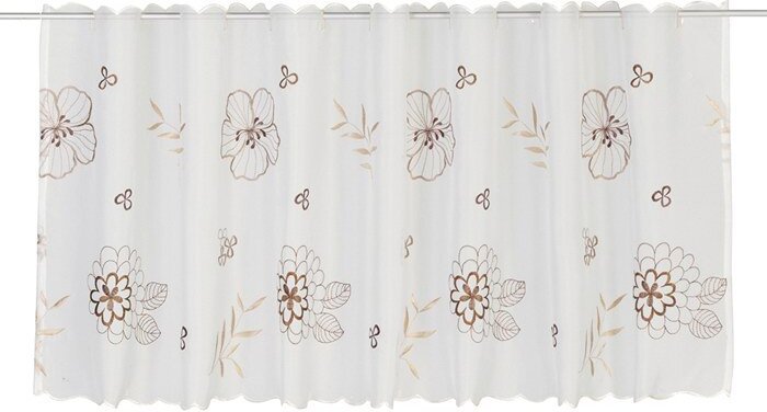 Wunderschöne bestickte Blumen in verschiedenen Brauntönen machen aus dieser weißen, transparenten Scheibengardine ein sehr natürliches Dekorationselement für Ihr Fenster.