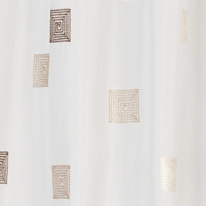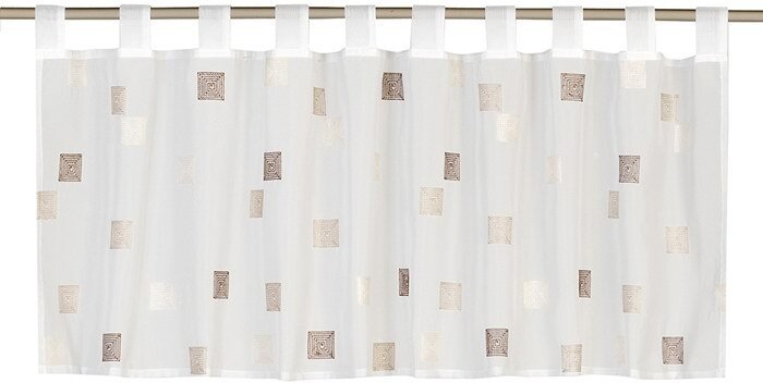 Aufgestickte Quadrate in verschiedenen Brauntönen machen aus dieser weißen, transparenten Scheibengardine eine modische Fensterdekoration.