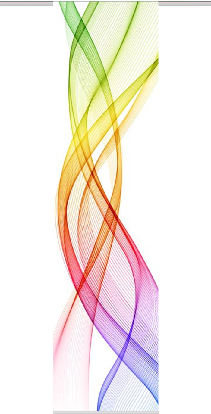 Wellenförmige Streifen mit Farbverlauf von Grün, Gelb, Rot, Lila und Blau verleihen diesem weißen Schiebevorhang ein frisches Dessin. Der Vorhang lässt sich problemlos kürzen.