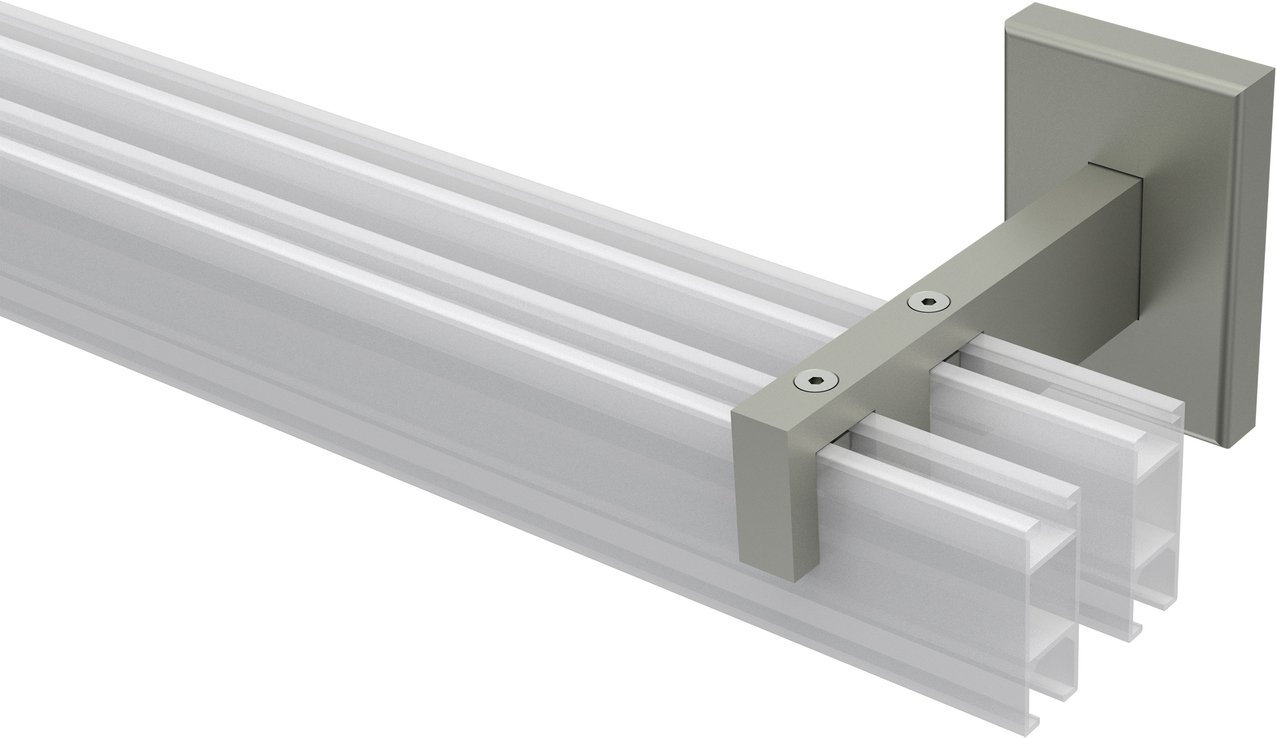 An diesem doppelläufigen Innenlaufträger Modell Smartline wird eine zweiläufige Innenlaufstange mit 14x35 mm an der Wand befestigt. In die zwei hintereinander liegenden Ansparungen dieses zweiläufigen Innenlaufträgers werden die eckigen Innenlaufprofile von unten eingesetzt und mit den Schrauben und Gewindestücken mit dem Träger verbunden. Die enthaltene Montageplatte für die Wandmontage wird von einer rechteckigen Rosette verdeckt.